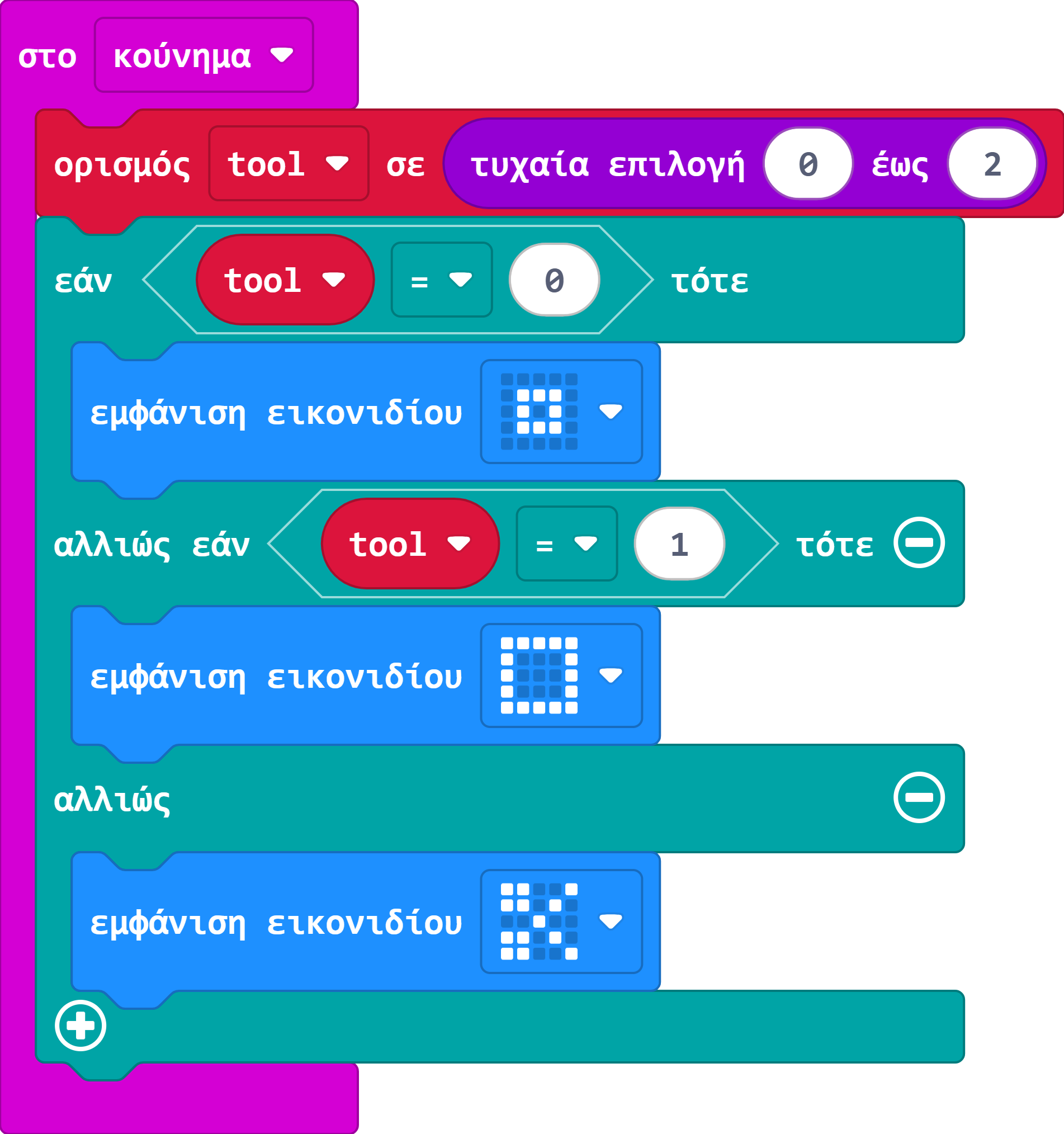 - Το πρόγραμμα χρησιμοποιεί επιλογή για να αποφασίσει ποια εικόνα θα εμφανιστεί στην οθόνη LED . Εάν ο τυχαίος αριθμός ήταν 0, δείχνει ένα εικονίδιο βράχου, εάν ήταν 1 δείχνει το εικονίδιο που αντιπροσωπεύει το χαρτί. Εάν δεν ήταν 0 ή 1, πρέπει να είναι 2, επειδή δώσαμε εντολή στο micro:bit να επιλέγει μόνο τυχαίους αριθμούς μεταξύ 0 και 2, οπότε σε αυτήν την περίπτωση δείχνει ψαλίδι.